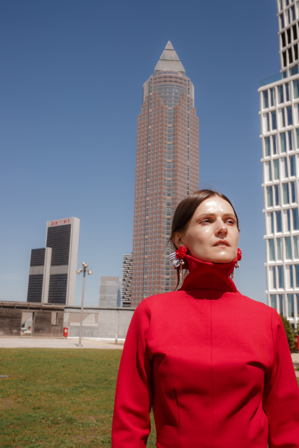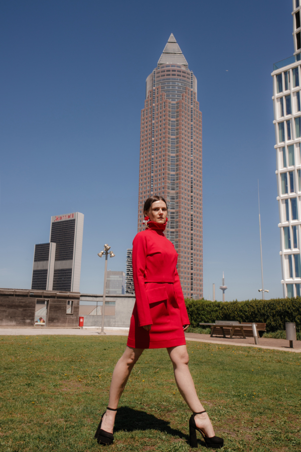 Der dichte, elastische Stoff betont die Silhouette und sorgt gleichzeitig für hohen Tragekomfort. Der hohe Kragen, die langen Ärmel und die markanten aufgesetzten Taschen verleihen dem Kleid eine architektonische, urban-futuristische Ästhetik. Perfekt für selbstbewusste, stilvolle Frauen, die Originalität und klare Linien schätzen.